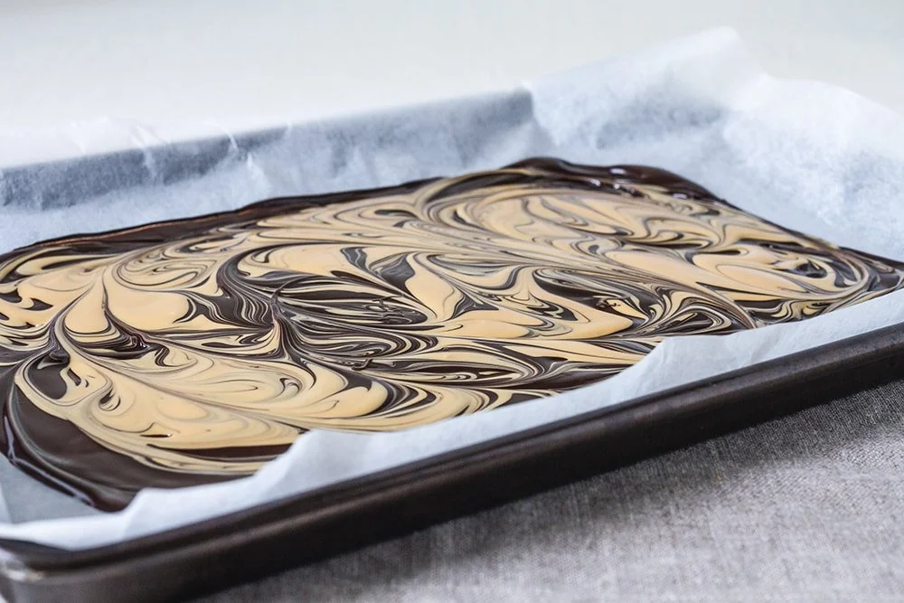 2. Pour the dark chocolate onto the baking paper and spread evenly with the spatula. Repeat the process with the bain-marie to melt the blond chocolate. Once melted, add dollops of it on the dark chocolate. Use a skewer or chopstick to create beautiful swirls that will marble the two chocolates together..